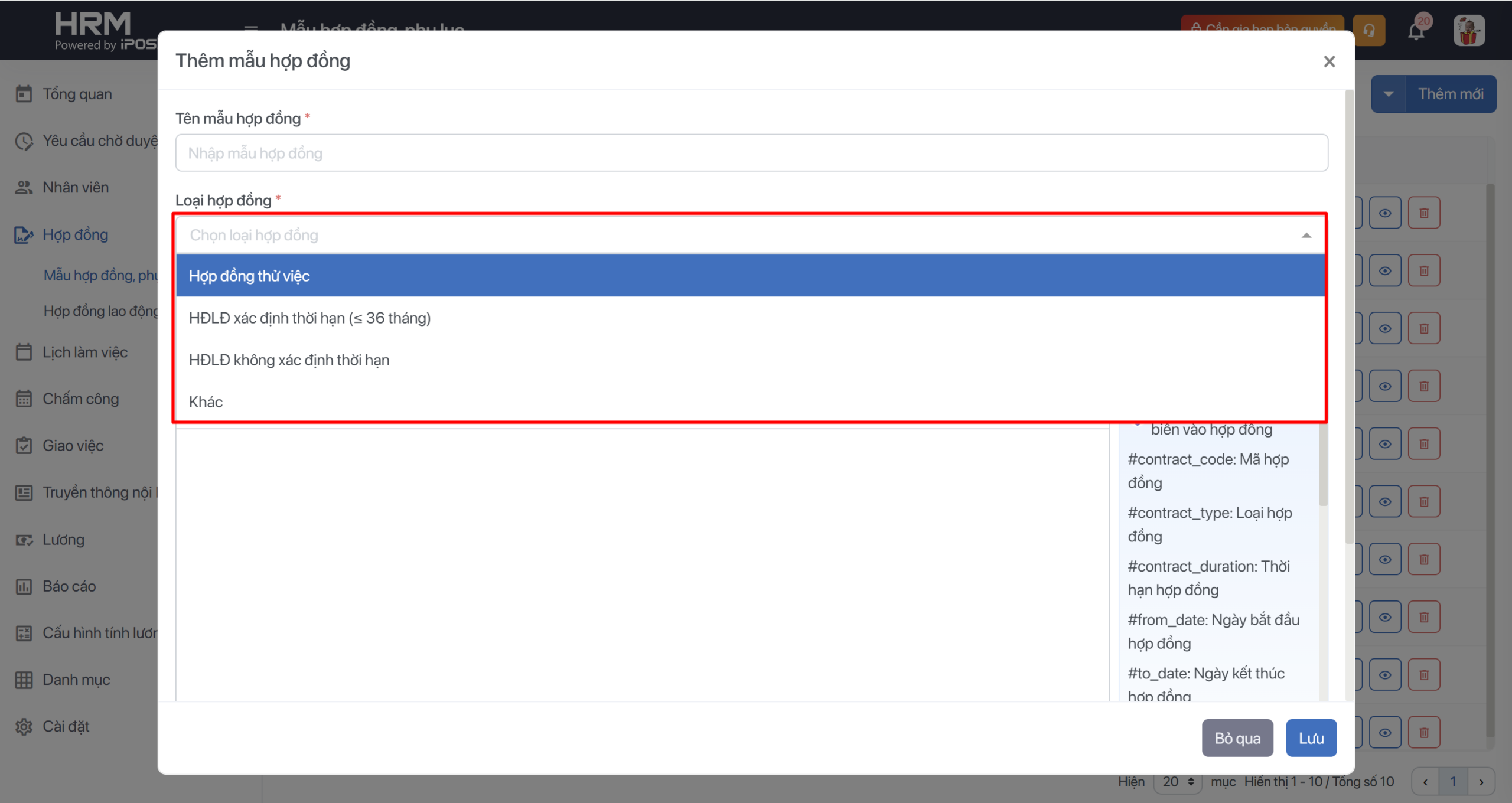 - Thêm hợp đồng: Chọn loại hợp đồng và mẫu hợp đồng bạn muốn thêm cho nhân viên.