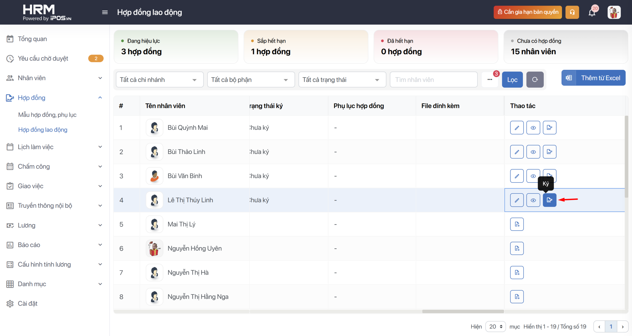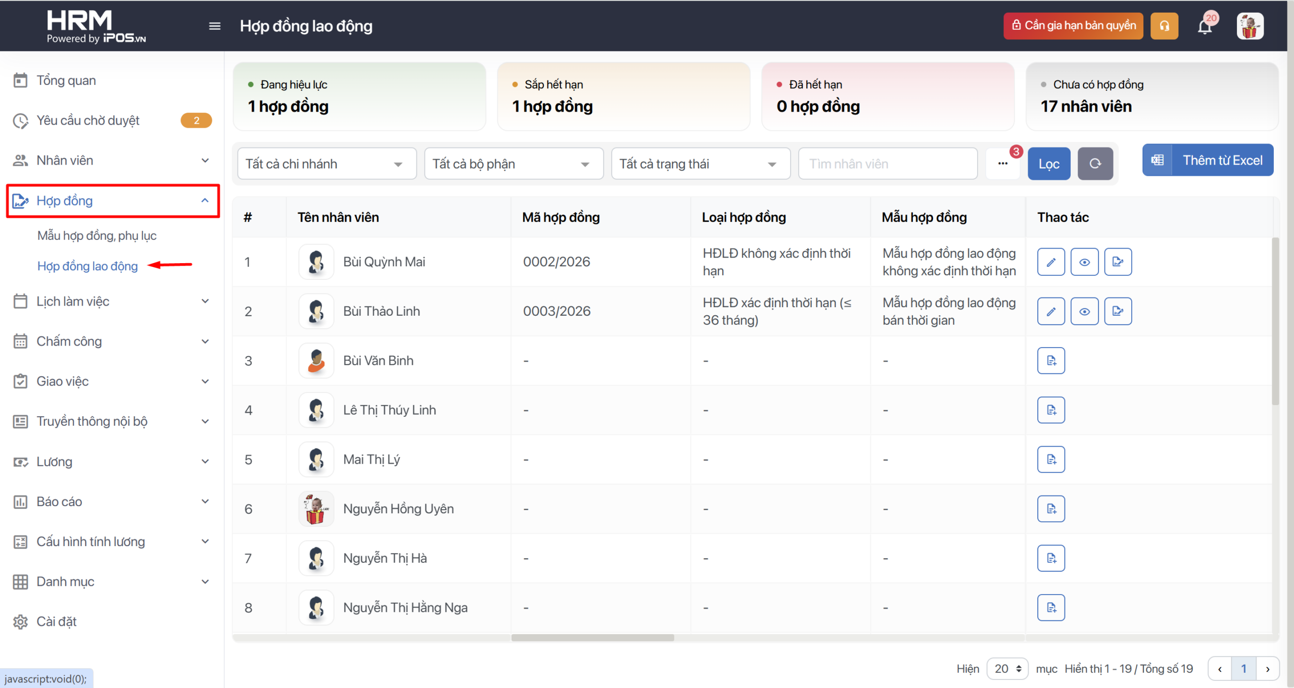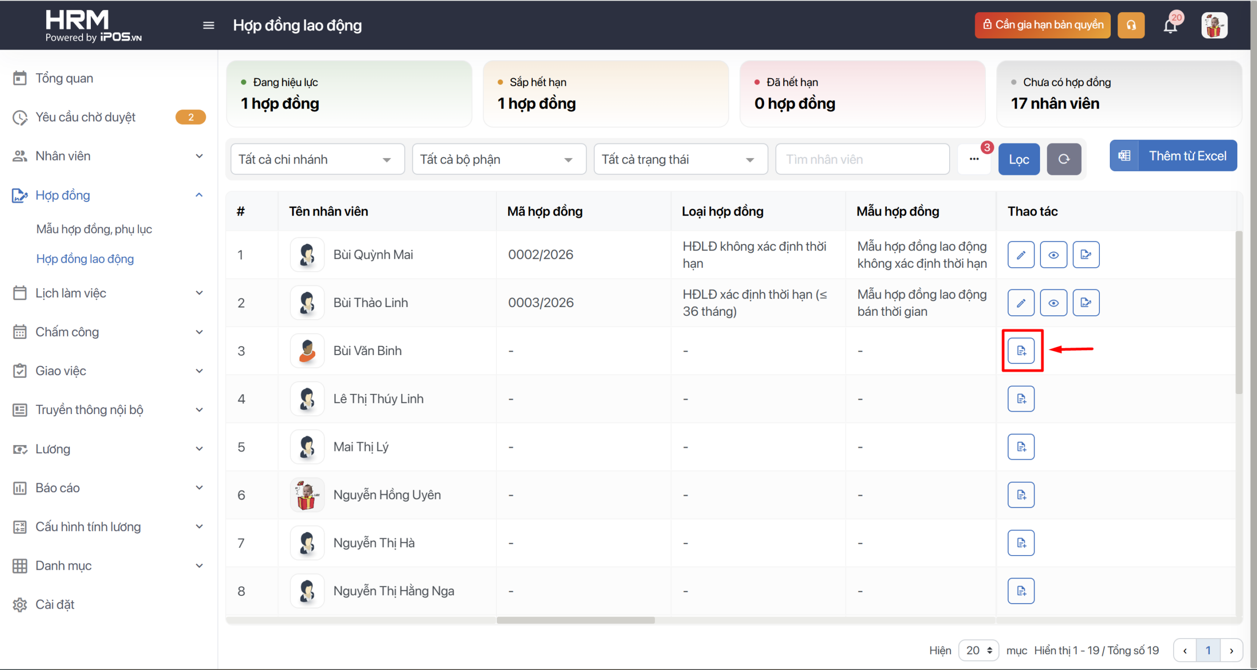 - Toàn bộ danh sách nhân viên và trạng thái hợp đồng của họ sẽ hiển thị tại màn Hợp đồng lao động với các trạng thái liên quan.