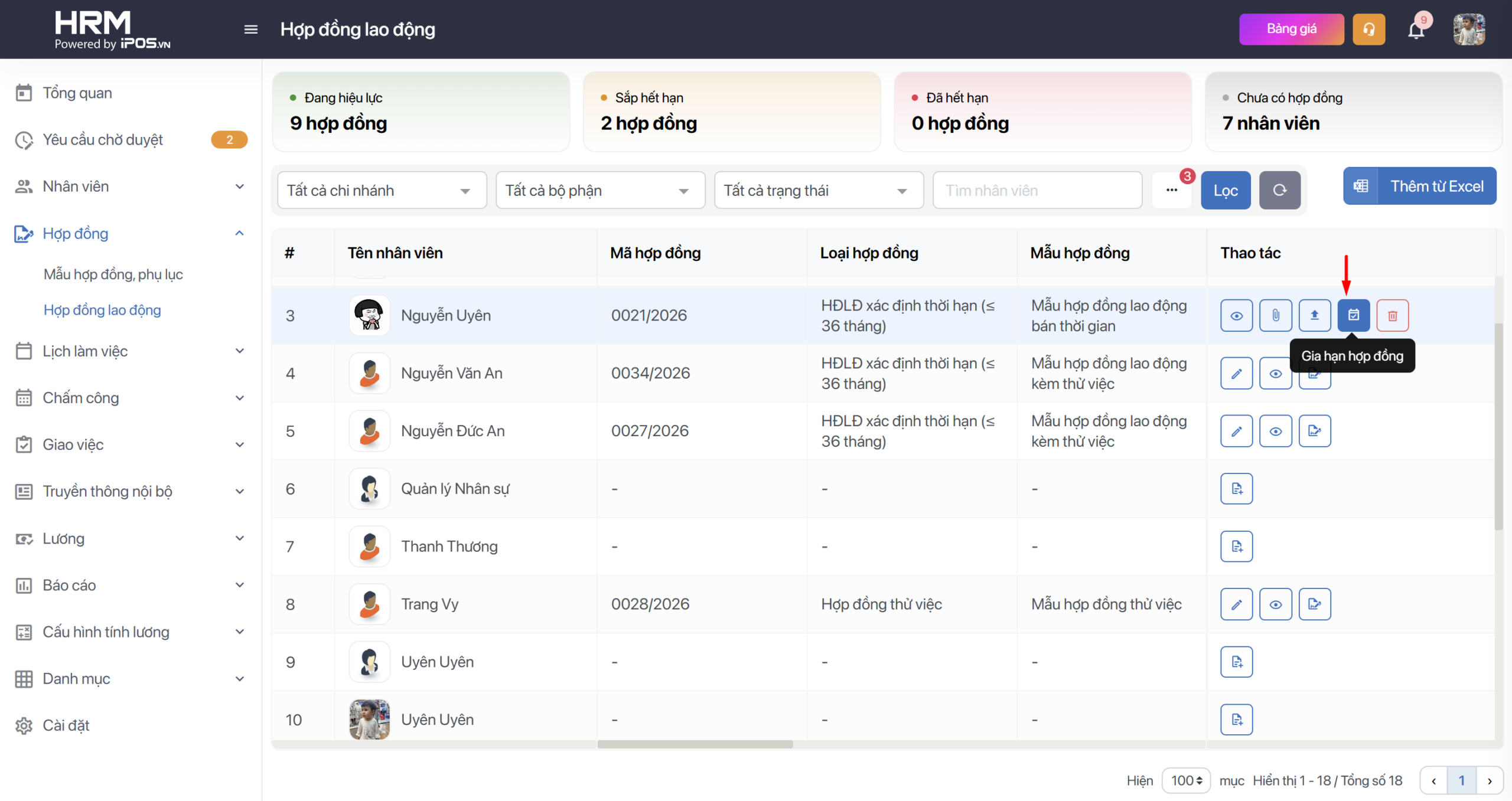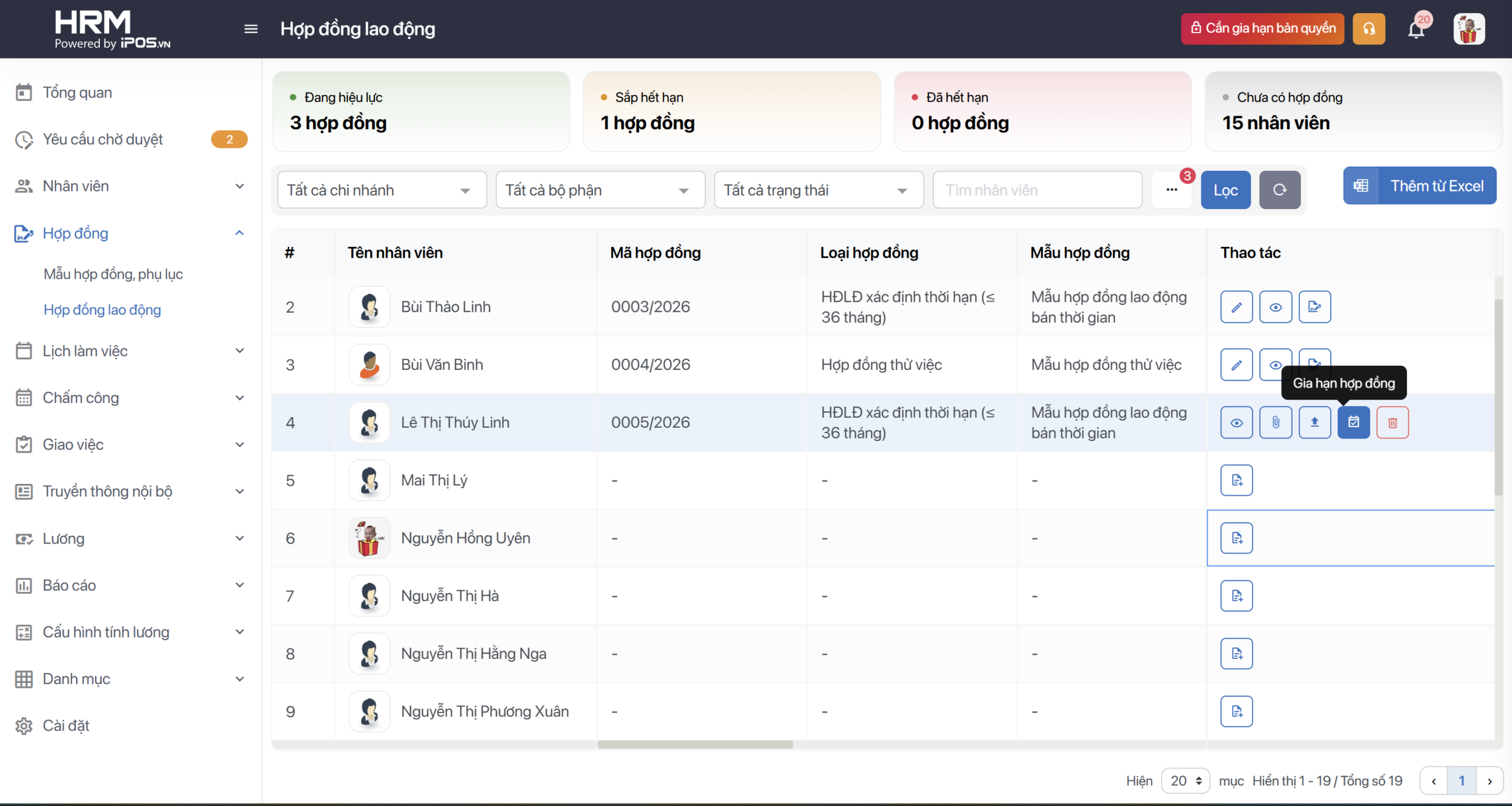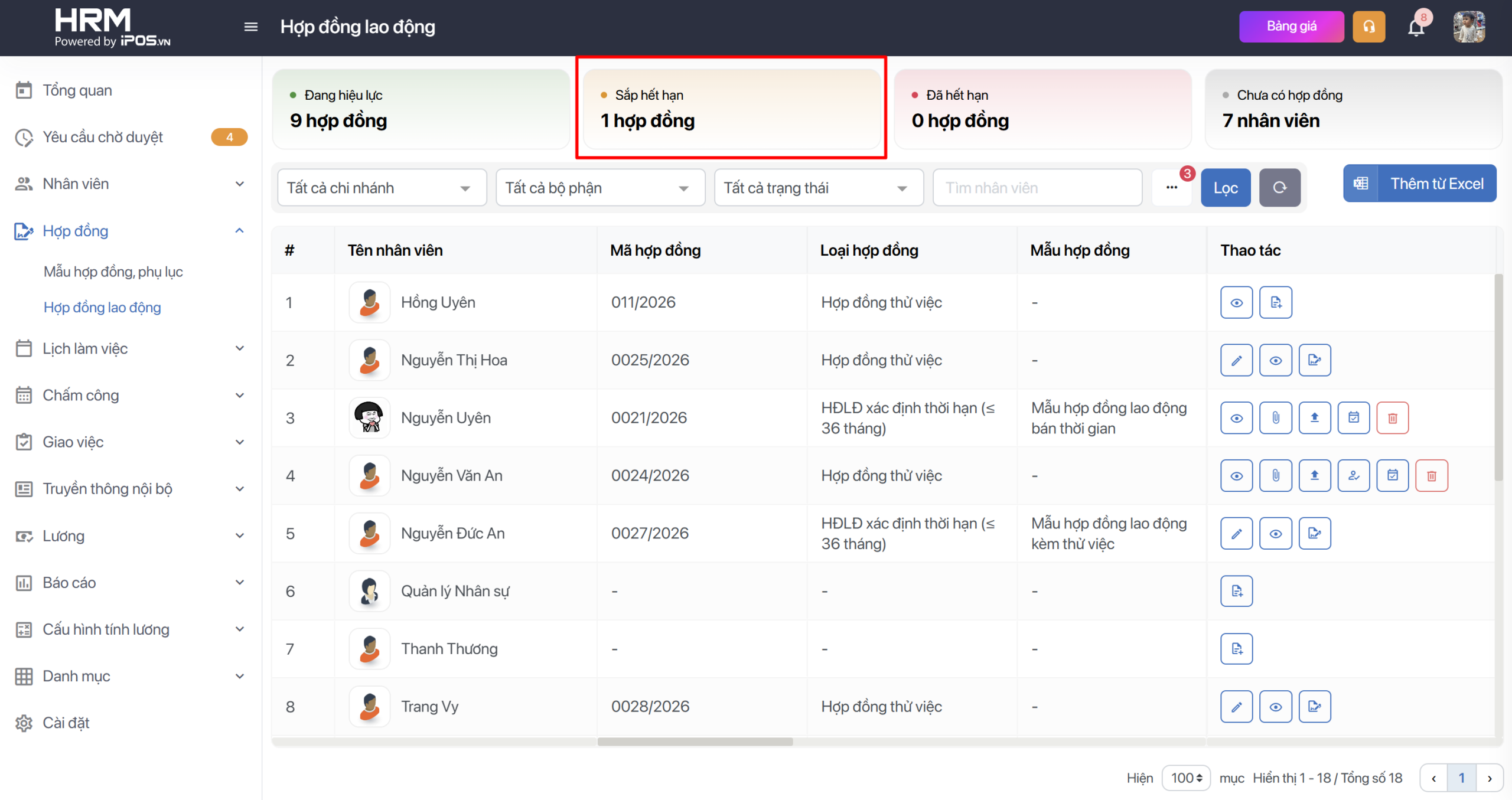 - Toàn bộ danh sách nhân viên và trạng thái hợp đồng của họ sẽ hiển thị tại màn Hợp đồng lao động với các trạng thái liên quan.