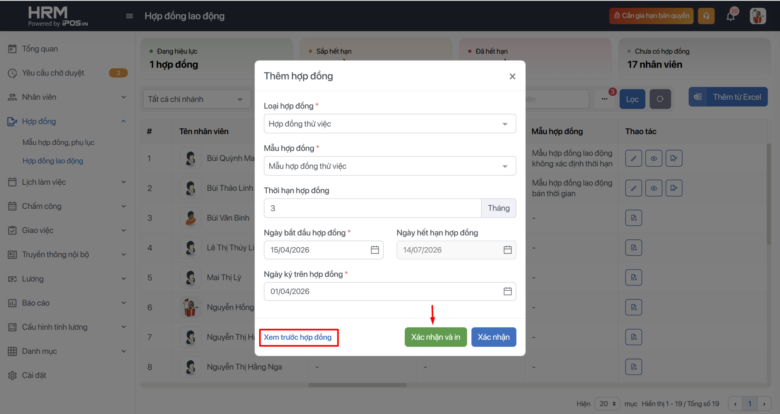 → Có thể chọn nút xem trước để check lại các thông tin trên hợp đồng, sau đó bạn có thể chọn xác nhận để hoàn thành công việc.