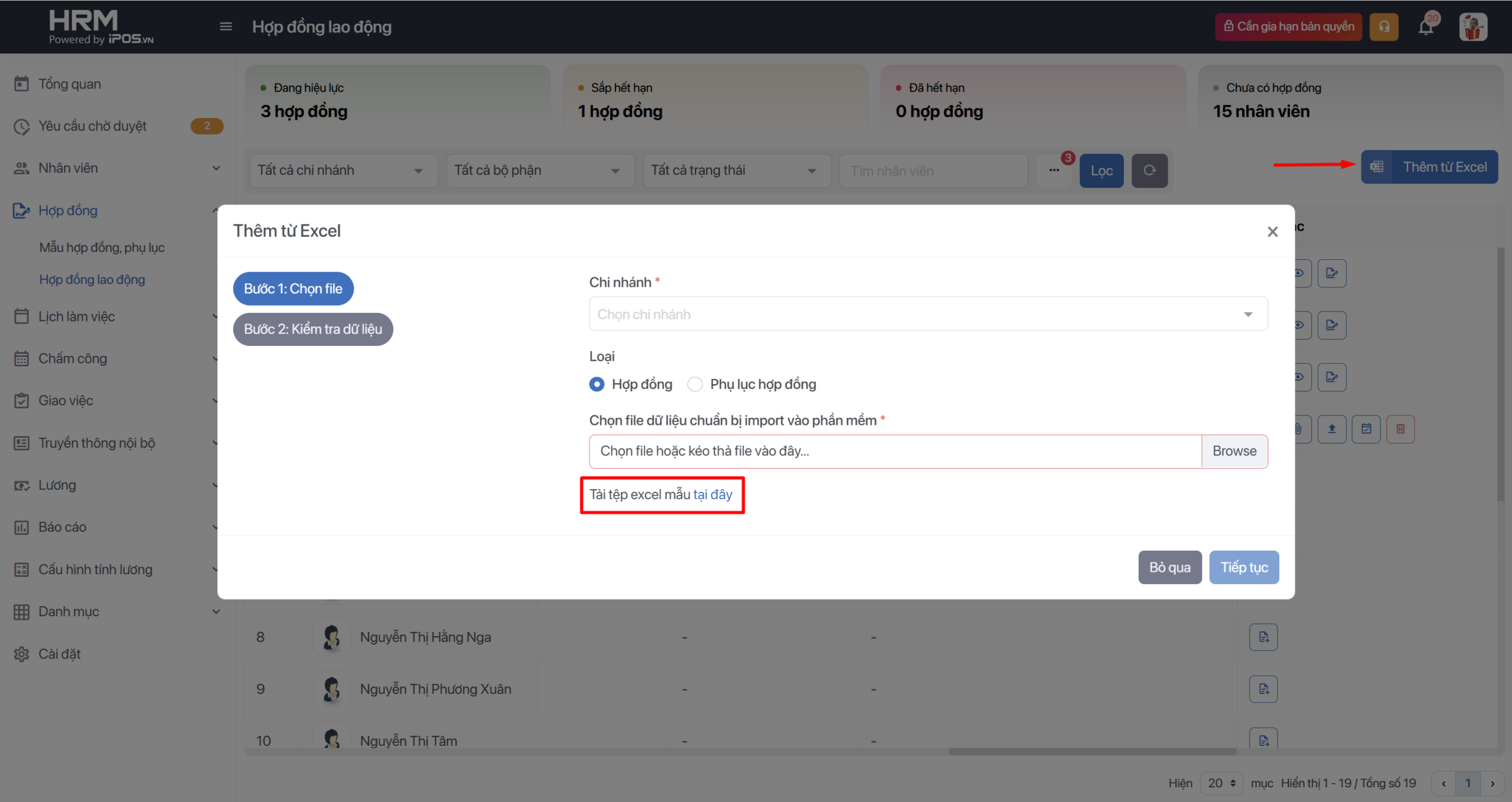 - Chọn Thêm từ Excel, sau đó chọn chi nhánh và tải tệp mẫu. Thao tác tương tự với thêm phụ lục hợp đồng.