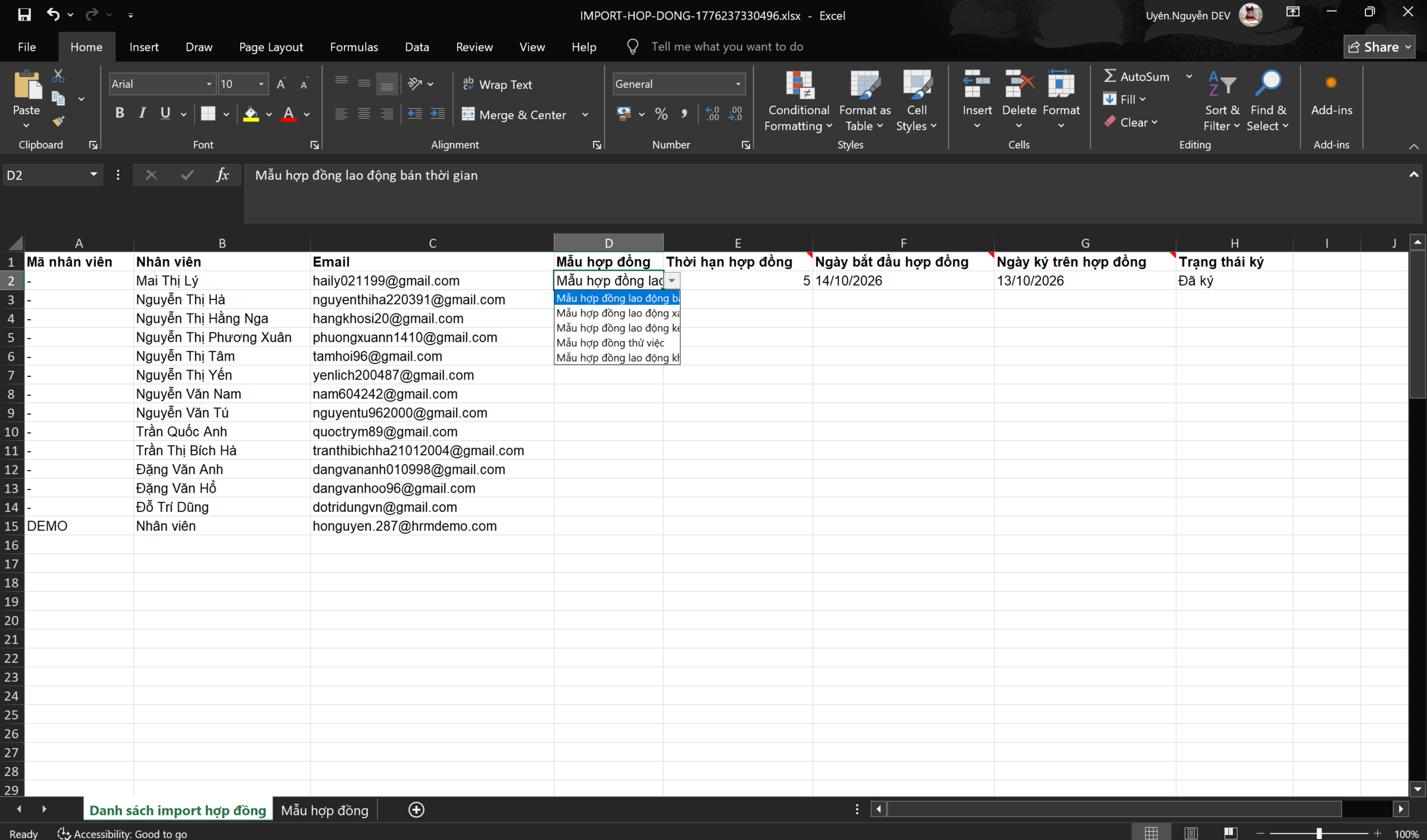 + Thời hạn hợp đồng: Để định dạng số. Ví dụ: 5 = 5 tháng đối với các loại hợp đồng xác định thời hạn.