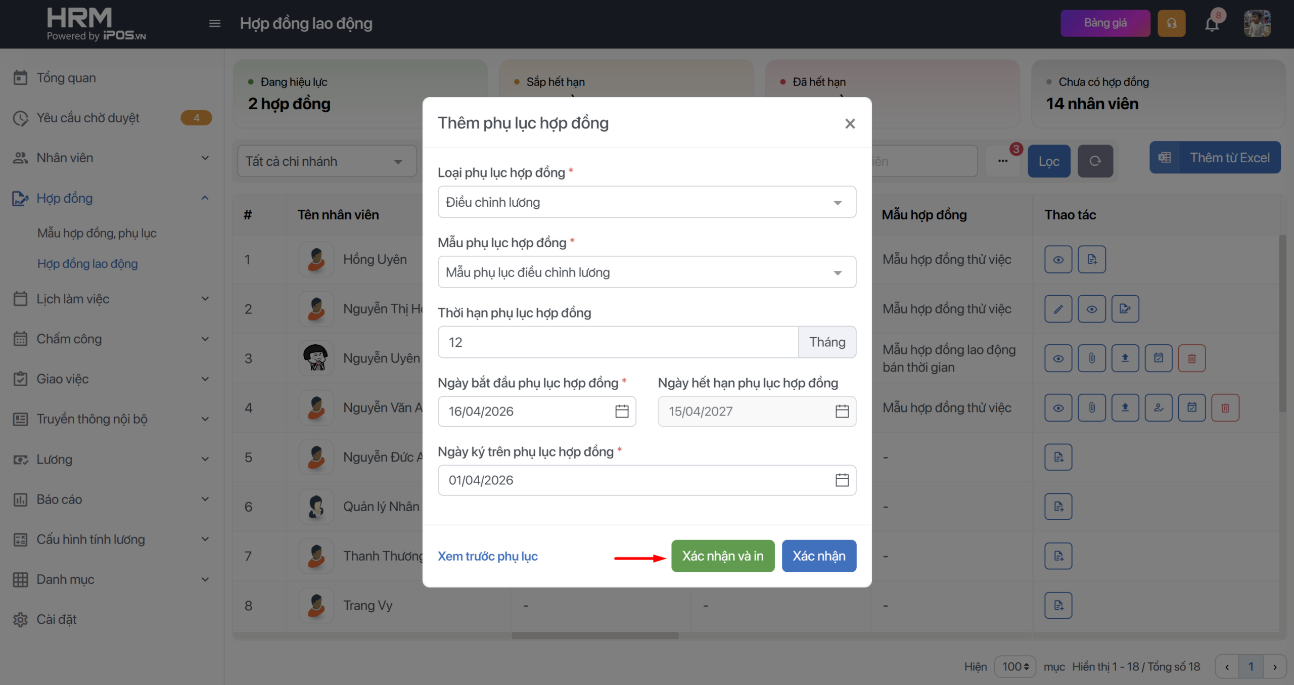 → Thêm phụ lục theo quy chế của công ty bạn bằng các mẫu phụ lục bạn đã tạo trước đó. Điền đầy đủ thời hạn phụ lục, ngày bắt đầu phụ lục vv. Sau đó bấm Xác nhận để hoàn thành công việc.