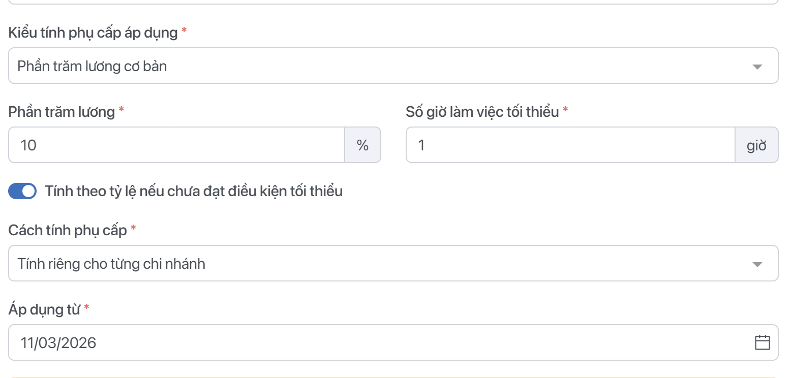 Tính theo tỷ lệ nếu chưa đạt điều kiện tối thiểu: Khi bật tính năng này lên, nhân viên không cần làm đủ số công hoặc số giờ tối thiểu để đạt phụ cấp. Hệ thống sẽ tính toán theo tỷ lệ đạt được để ra được phụ cấp. Ví dụ: Nhân viên làm tối thiểu 20 công sẽ được phụ cấp 1.000.000vnđ, bật tính theo tỷ lệ nhân viên làm được 10 công sẽ nhận được 1.000.000vnđ/ : 20 * 10 = 500.000vnđ.