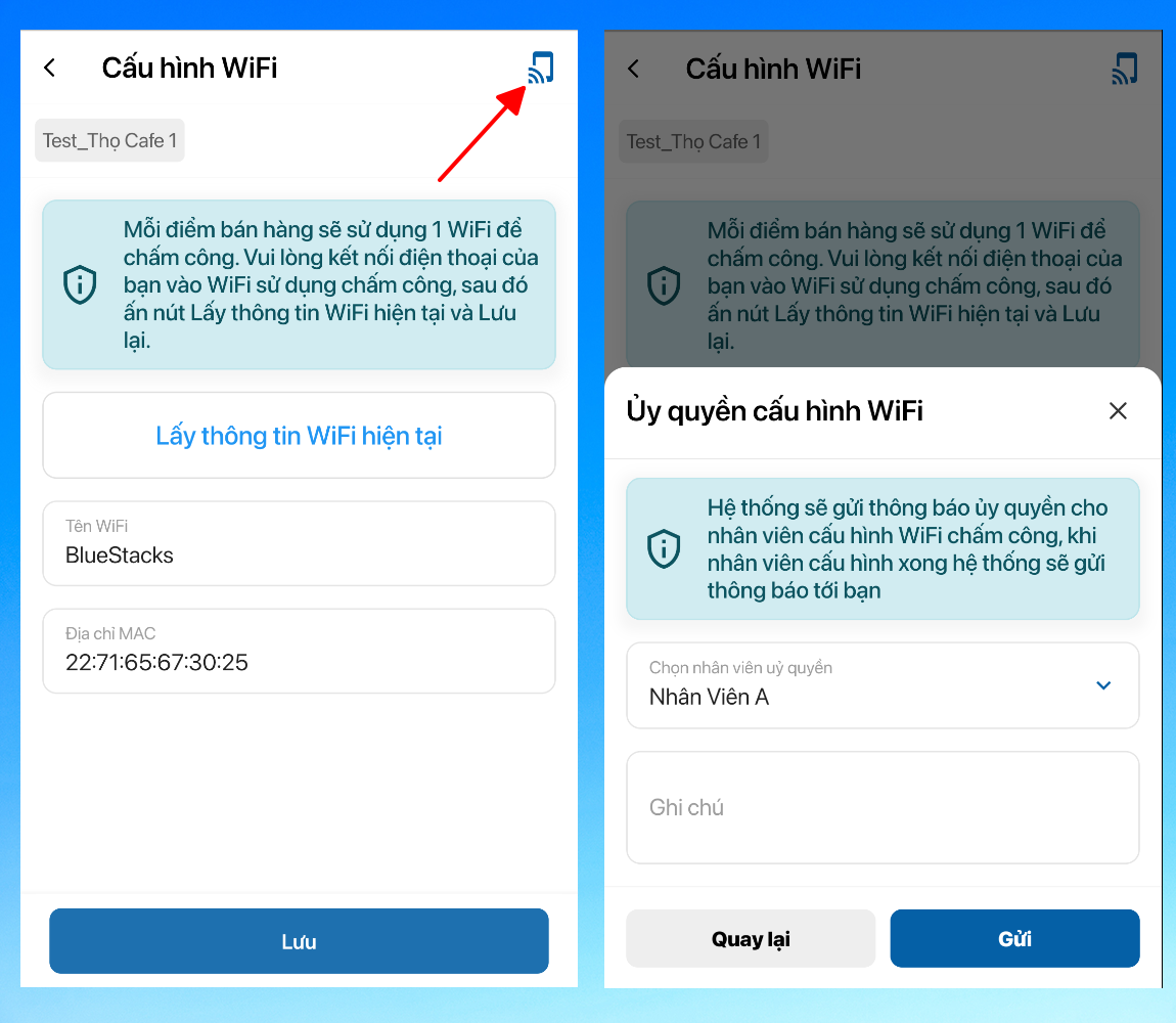 Trong trường hợp bạn không thể đến điểm bán để cấu hình Wifi, bạn có thể ủy quyền cho 1 bạn nhân viên ở điểm thực hiện điều đó.