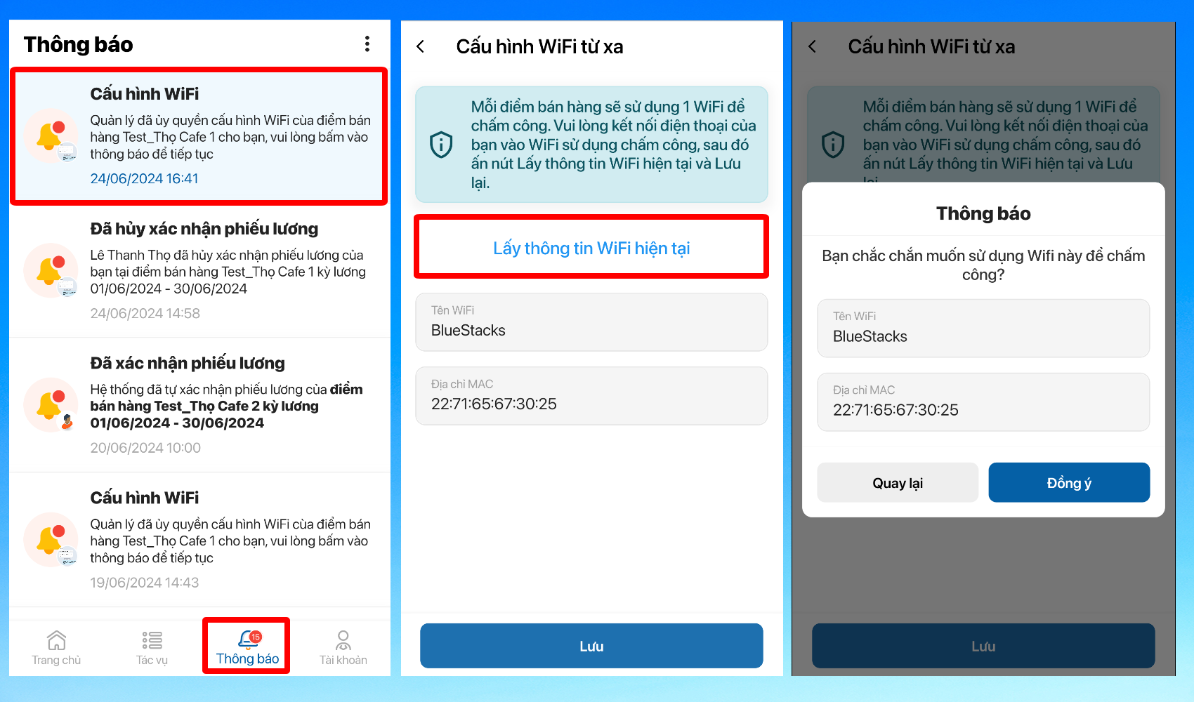Bước 2: Nhân viên vào mục Thông báo chọn vào thông báo với nội dung Cấu hình wifi → nhân viên lấy điện thoại của mình kết nối đúng Wifi cửa hàng rồi chọn vào nút Lấy thông tin tin WIFI hiện tại rồi chọn vào nút Lưu → kiểm tra lại thông tin rồi chọn vào nút Đồng ý để hoàn thành công việc