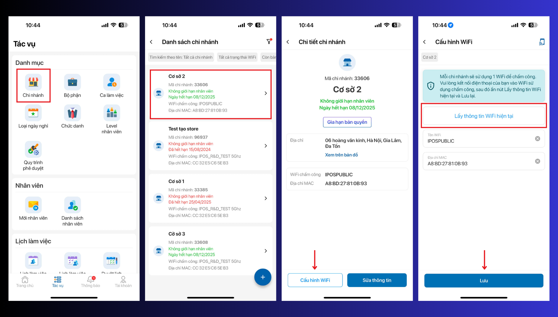 Bước 2: Trên thanh tác vụ → Chi nhánh → chọn Chi nhánh muốn cấu hình Wifi → Cấu hình wifi → Lấy thông tin Wifi hiện tại → chọn Lưu để hoàn thành công việc.